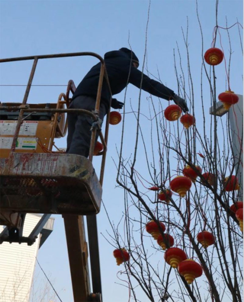 為給園區(qū)營(yíng)造濃厚的節(jié)日氣氛,給入駐企業(yè)帶來(lái)如家般的溫情呵護(hù),沈陽(yáng)航發(fā)展運(yùn)營(yíng)管理有限公司物業(yè)團(tuán)隊(duì),在零下二十度的氣溫下,凍紅了雙手,冰覆了睫毛,但他們依然堅(jiān)守,扶梯的扶梯、攀爬的攀爬,將火紅的燈籠掛在園區(qū)主干道、企業(yè)門前。滿街的火紅,是他們對(duì)園區(qū)的熱愛(ài),也是對(duì)工作的執(zhí)著,更是對(duì)崗位責(zé)任的滿滿執(zhí)念。園區(qū)的燈亮了,客戶們洋溢的笑臉,映襯著角落里一道道靚麗的風(fēng)景線,夜幕降臨下,五彩斑斕的彩色燈光給園區(qū)增添了不少喜慶的色彩,也深深的印在了師傅們熱切的心里。