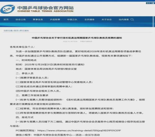 “乒乓世界”消息,中國乒乓球協(xié)會官網(wǎng)于12月20日正式發(fā)布《中國乒乓球協(xié)會關于舉行洛杉磯奧運周期國家乒乓球隊教練員競聘的通知》,正式啟動新周期國家隊教練員公開競聘工作。