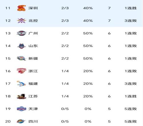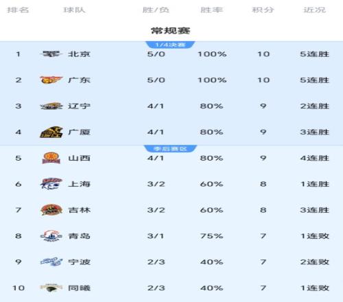 隨著廣東+上海+廣廈全贏球,CBA最新積分榜如下:2隊(duì)全勝+2隊(duì)全敗